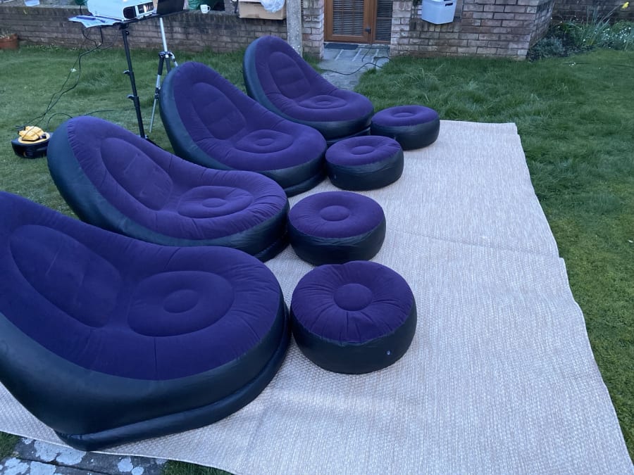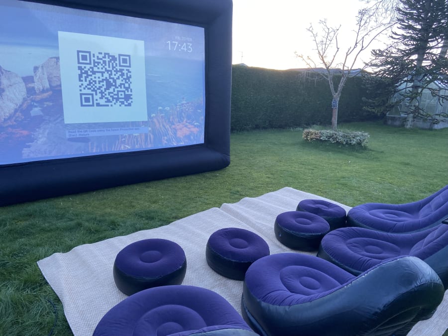 Experience cinematic magic with our giant 200" inflatable cinema screen paired with a top-of-the-line 4K Full HD Epson projector. With a built-in 13w speaker, you'll enjoy immersive sound without the need for any external speakers (for large groups an external speaker may be required, this is the customers responsibility). Plus, we provide comfortable bean bags, ensuring everyone has a cozy seat. Additionally, an extra stand is included for your devices, making setup a breeze.