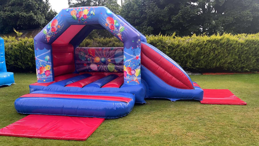 Blue and red party castle with slide in Lisburn, Belfast, Hillsborough, Ballynahinch, Dromore, Banbridge, Moira, Crumlin, Glenavy, Saintfield — bright, fun, and built for laughter. 🎉 This blue and red bouncy castle with slide is perfect for birthday parties and events. It delivers safe, high-energy entertainment for kids and peace of mind for adults.